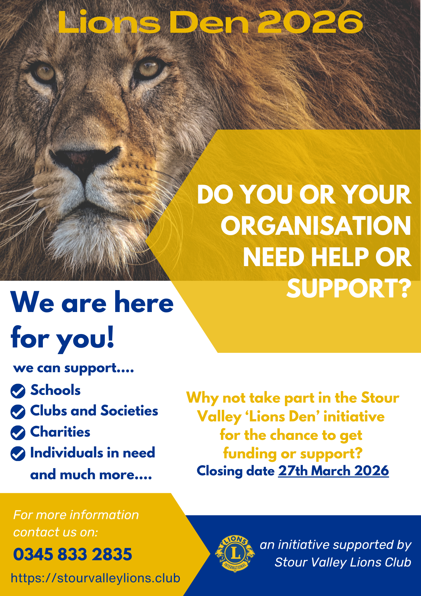 We are looking to provide funds – and other support – for local good causes as well as people most in need. The Lions’ Den initiative is open to local charities, groups and individuals. All we ask is that bids have a strong civic, youth or welfare element – there are no specific application criteria. Those wishing to bid for our support, please make an application before 27th March 2026.
